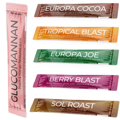 Kies uit: Europa Joe = koffie Europa Cocoa = chocolademelk Tropical Blast = sap met ananassmaak Berry Blast = frambozensmaak Glucomannan = per...